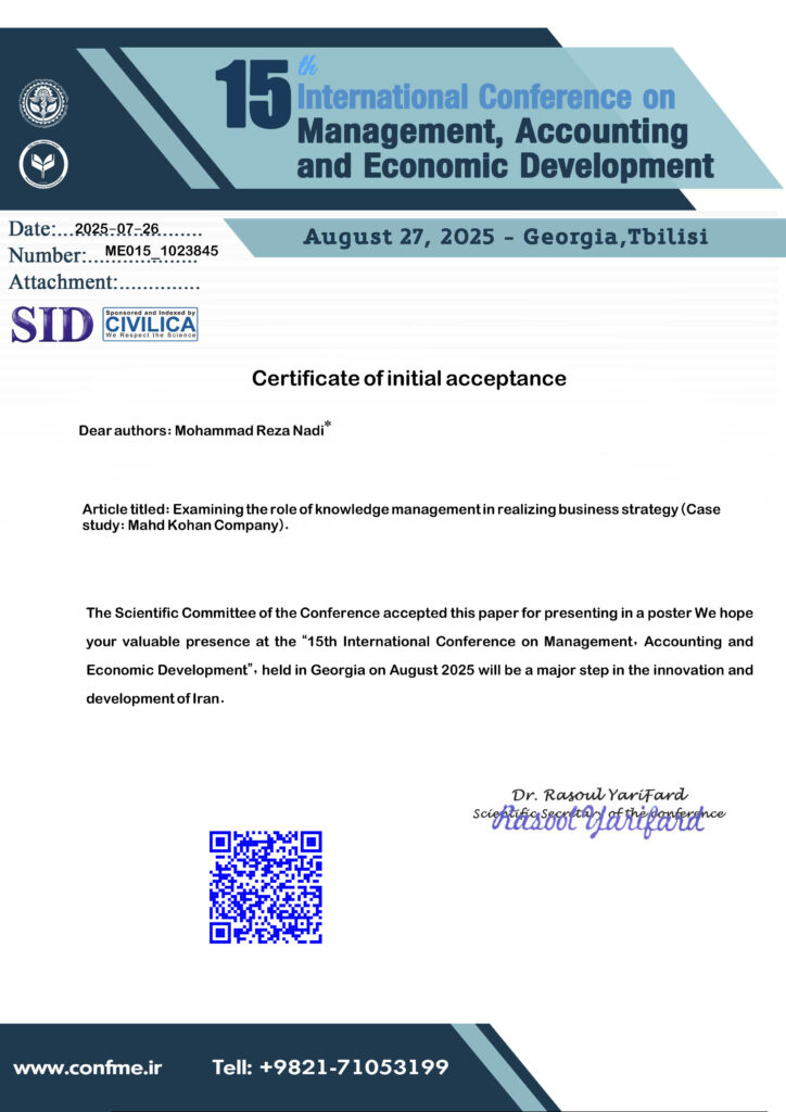 تصویر گواهی ثبت و انتشار مقاله بررسی نقش مدیریت دانش در تحقق استراتژی کسب و کار