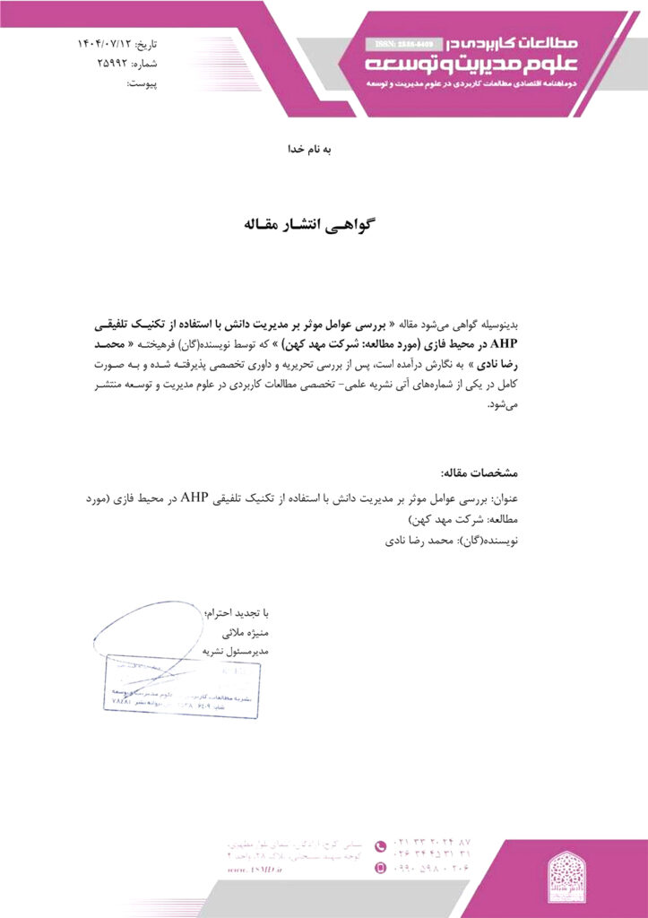 تصویر گواهی ثبت و انتشار مقاله در مرکز مطالعات کاربردی علوم مدیریت و توسعه